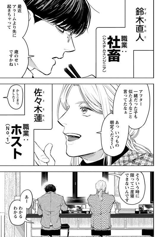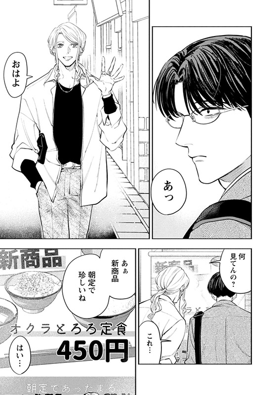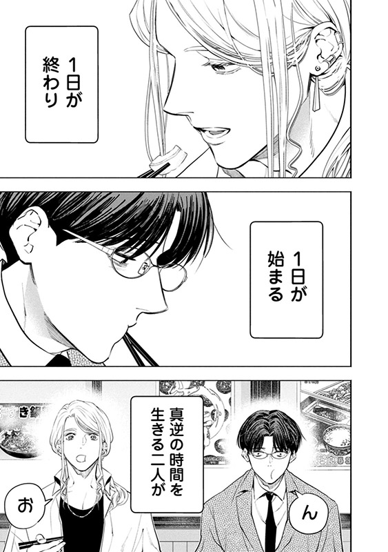 【午前5時の牛丼屋。隣の席で朝ごはん。】 午前5時、新宿歌舞伎町の牛丼屋で出会った「社畜」の直人と「ホスト」の蓮。並んで朝ごはんを食べるだけの、ちょっと不思議な関係がはじまる――。 これから一日が始まる社畜と、ようやく一日が終わるホスト。真逆な時間軸を生きる二人が唯一交わる15分を描いた、モーニングルーティンストーリー。