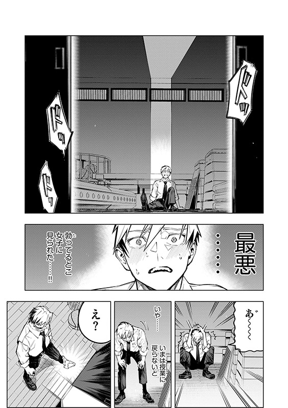咄嗟に身を隠した大上だったが、フラついた拍子に彼女に気づかれてしまう。