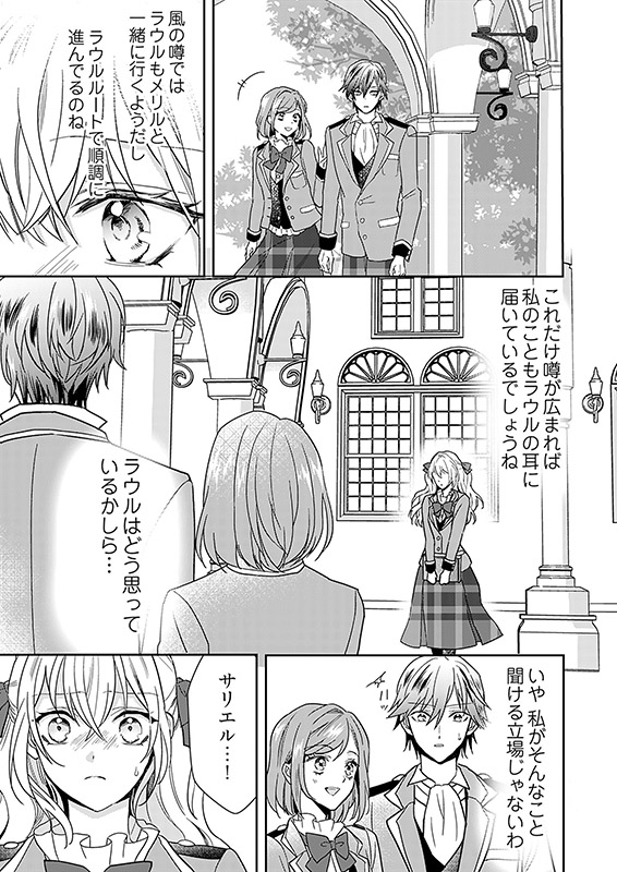 学園に入学後、死亡フラグを折るためにもゲームのヒロイン・メリルとラウルをどうにか引き合わせようとするサリエル。しかしダンスパーティーでの思いもよらぬハプニングをきっかけにナゼかラウル以外の攻略対象者とも親密になってしまい死亡フラグ乱立の危機…!?