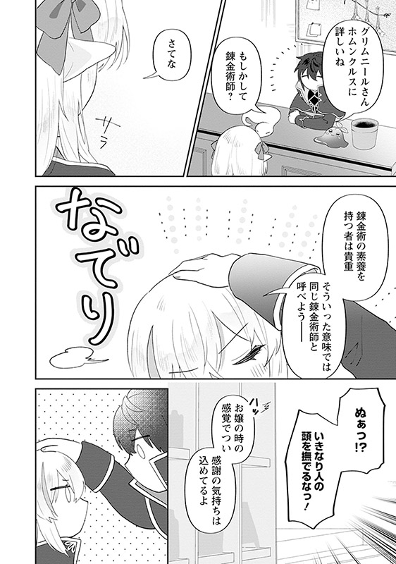 アレクサントのアトリエに突如訪問したエルフの少女グリムニールは、過去のアレクサントを知っているようだがホムンクルスの成長に必要な“進化の秘石”を託し、店を去ってしまう。