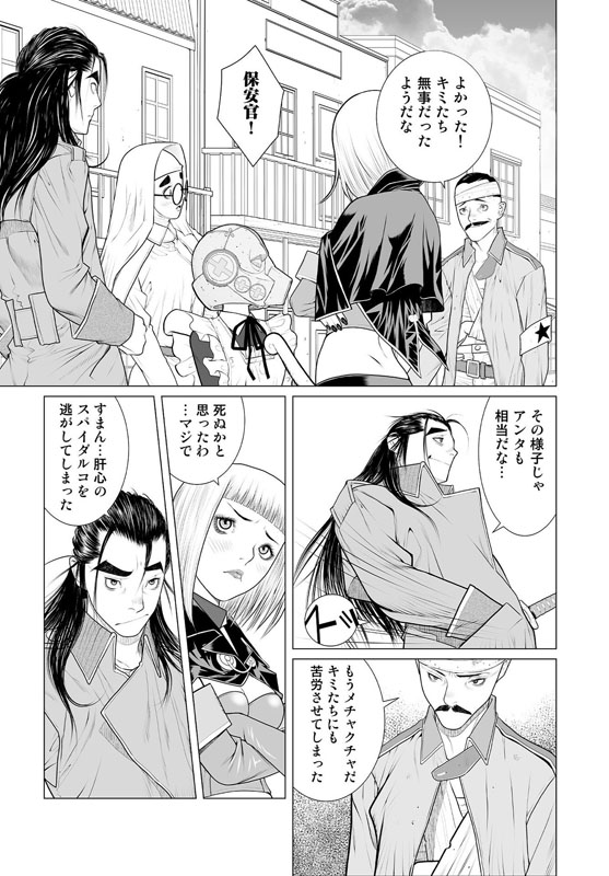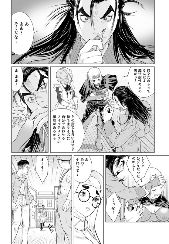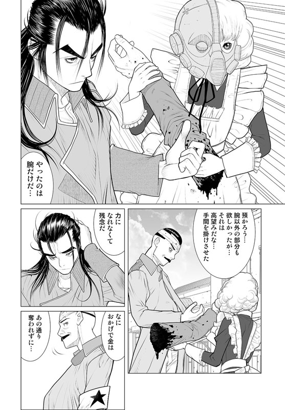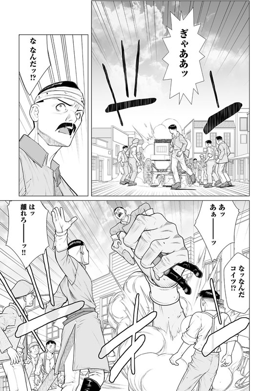 街はずれの廃墟内で男がふたり、剣をまじえようとしていた。片や鋭い突きが目にも止まらない速さの男、対峙しているのはその剣を鞘に収めたままの男……次の瞬間、稲妻のような一閃! 突きは空を切り、男の身体は真っ二つ! 生き残った男は大きなナタで○体の首をはねた……。
