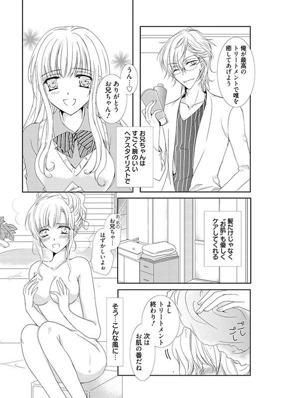 妹から見てもイケメンでヘアスタイリストの兄は、お風呂で私の「お肌」もケアしてくれる。「ほら、お兄ちゃんに全部…見せて?」。兄の手で絶頂に導かれることを止められない私だったけど、ある日彼氏に兄が付けたキスマークを見つけられててしまい、「所有印の上書きだな」…とキスを、そして濡れたアソコに彼のソレをあてがわれ――。