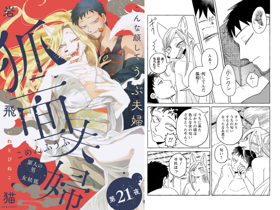 『透明男と人間女』の岩飛猫、最新作『狐面夫婦/こめんふうふ』 明治を舞台に描かれる【罪人の男×女妖狐】の”だまし愛”な夫婦の営み――。 現世と隠世がまじりあう世界に、古めかしい日本家屋が一軒。そこに暮らすは、人間の男と女狐の新婚夫婦。ふたりの仲睦まじい時を邪魔するのは、人喰い雀だけじゃなくて…? 人と妖の暮らしは、昼はキケンで夜は甘い!? SNSでも話題!ハードモードなピュア異類婚姻譚。