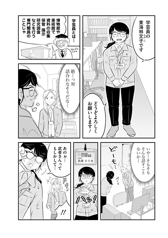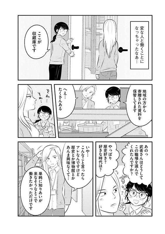 百人斬りの鬼武者と恐れられていた武者エリカは、誰も知らないところで働きたいと、地元の博物館の臨時職員に応募。まさか受かるわけがないと思っていたが採用されてしまい、働くことに。 そこで出会ったのは、見るからに話が合わなそうなマジメ学芸員の東海林文子。 ふたりと職場の面々の、心の交流を描くヒューマンドラマ。