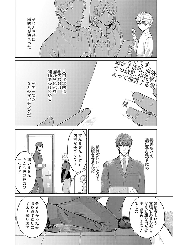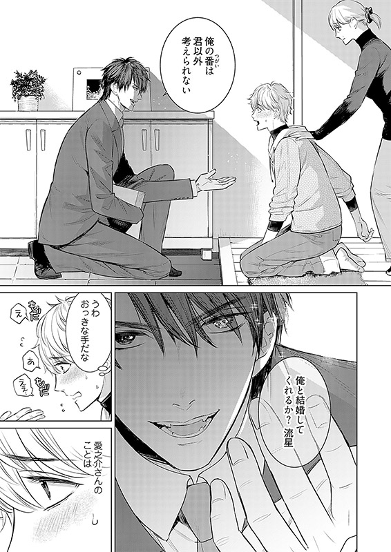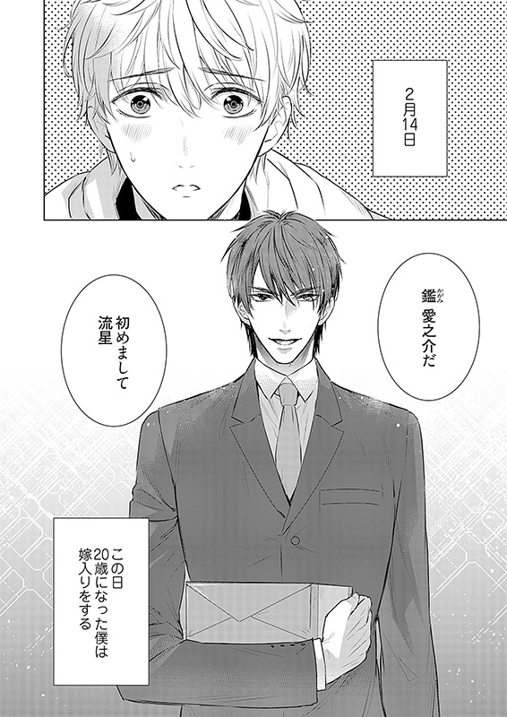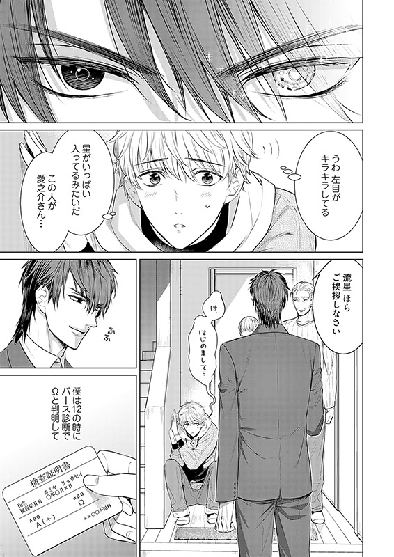20歳を迎えたΩの流星(りゅうせい)は、相性率が98%の自身の婚約者α・愛之介(あいのすけ)と結婚するため、初めて鑑(かがみ)家へやって来る。ところがそこには、彼の兄で同じくαの志穏(しおん)が待ち構えていた。そして相性率が100%の志穏と対峙し、初めての発情(ヒート)を経験することになりーー?優しく愛情深い愛之介と俺様で独占欲の強い志穏――二人に翻弄される流星は、いったいどちらの番になるのか――…。