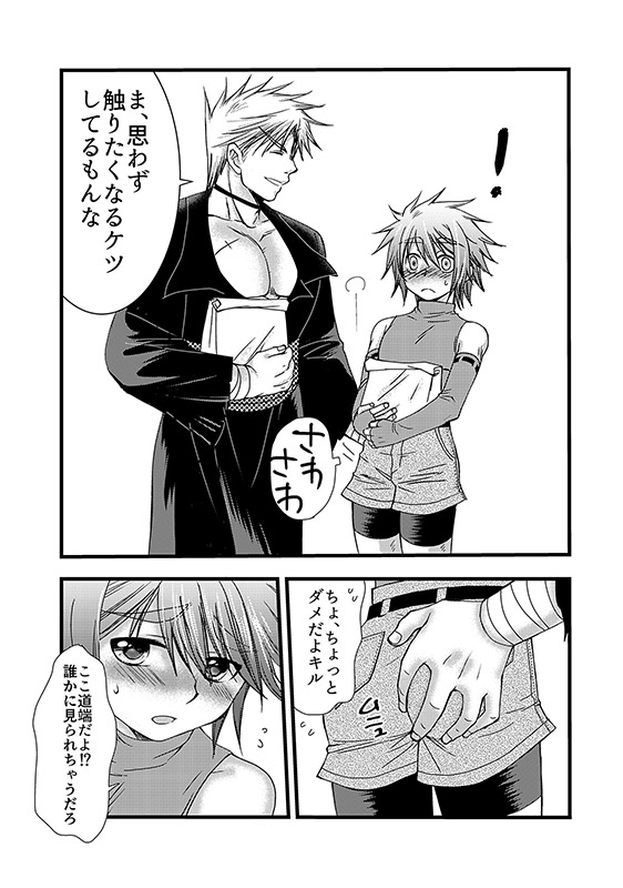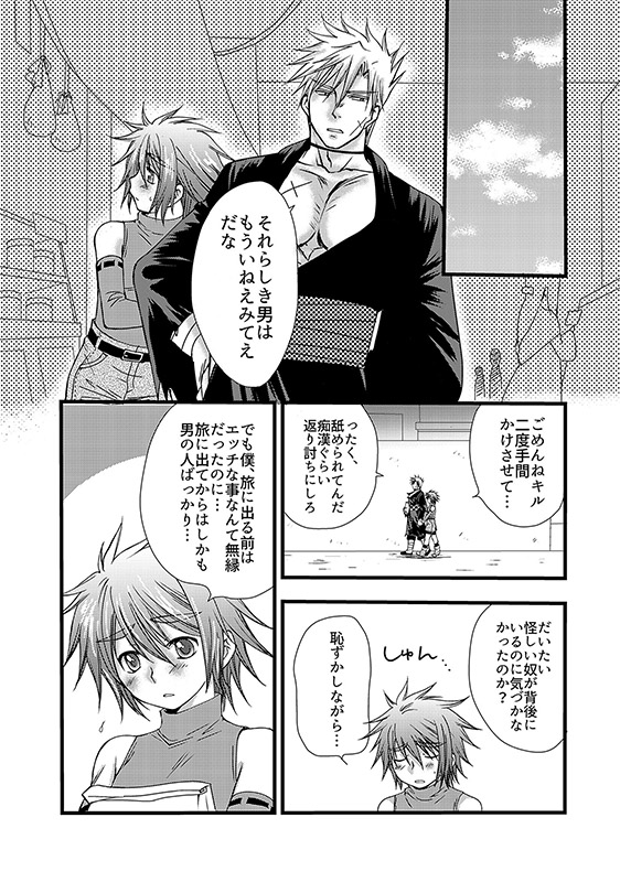 買い出し先で変質者に遭い、買い物の途中だったが思わず宿に帰ってしまうアッシュ。 仲間のキルを連れて現場へ戻るが変質者の姿は既になく、帰路につく途中いつの間にかキルにひと気のない路地裏に連れて来られて…。