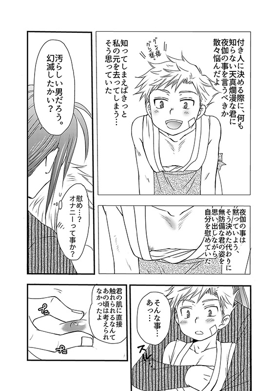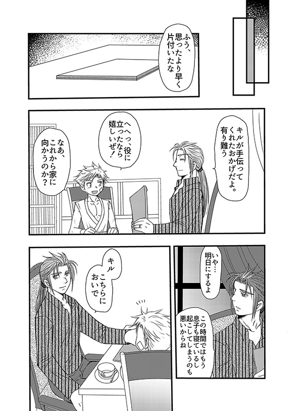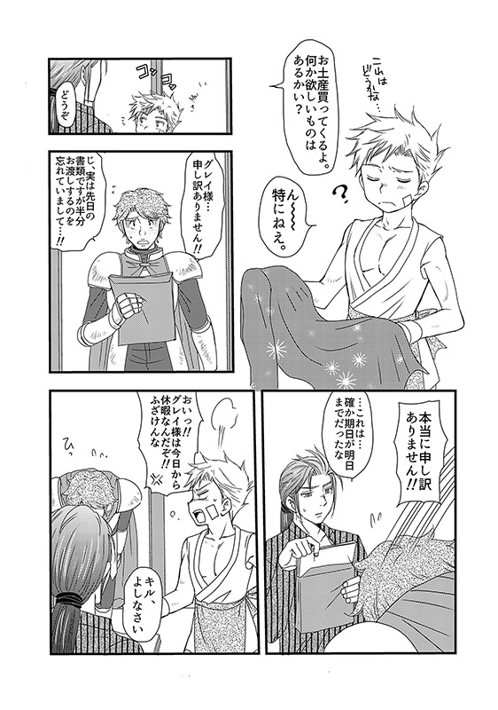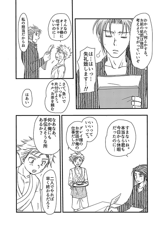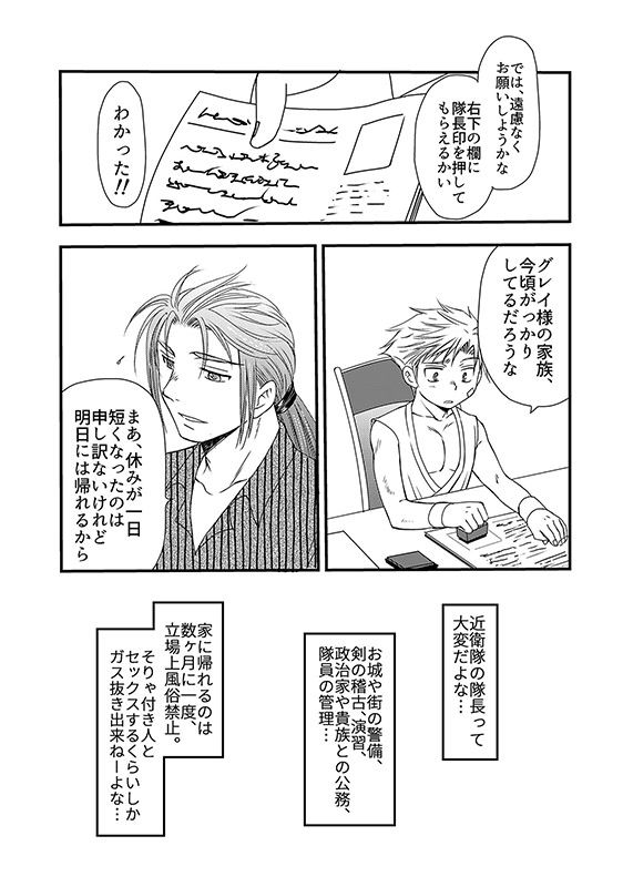 異国の郷土料理の屋台を開いていたキルは近衛隊長のグレイに料理の腕を見込まれ、城での仕事を誘われる。 やがてグレイの付き人となるキルだったがある日副隊長の付き人のコハクに「付き人の仕事のひとつに夜伽がある」という事を初めて聞かされ、 グレイがその事をなぜ隠していたのかと詰め寄り……