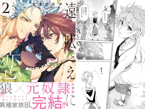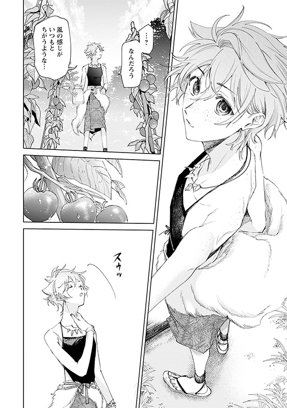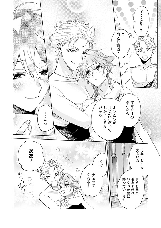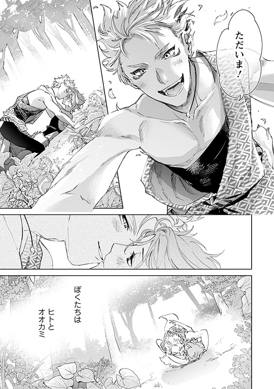 狼の縄張りとヒト里のあいだに家を建てた2人は、どちらの種族とも交流しながら、仲睦まじく暮らしていた。