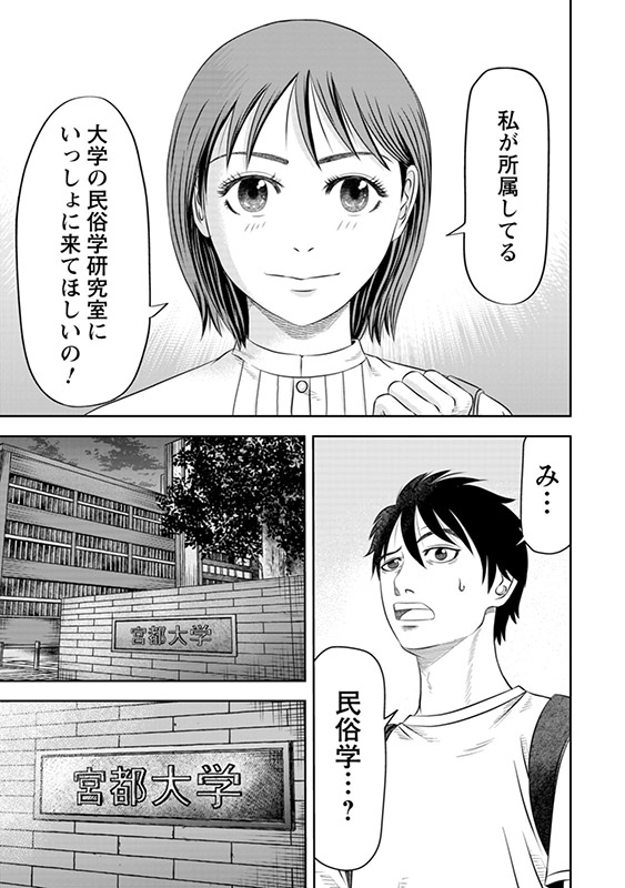唯一の親族との繋がりである祖母の形見をきっかけに、民俗学研究室の廃村調査に同行することになる。