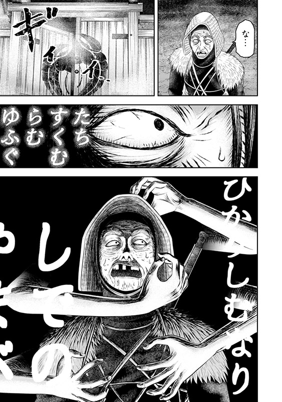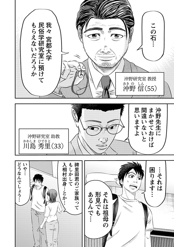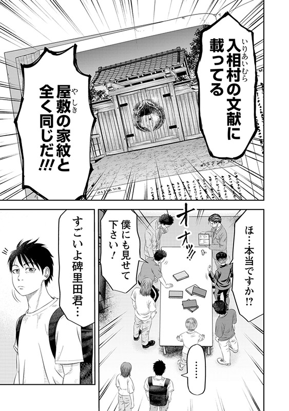 廃村に到着すると、研究室一行は元村民から手酷い対応を受けるが、「碑里田」の名を聞くと態度が一変。元村民たちから修は「御屋形様」「碑里田の御曹司」などと呼ばれ、大歓迎を受けることに。