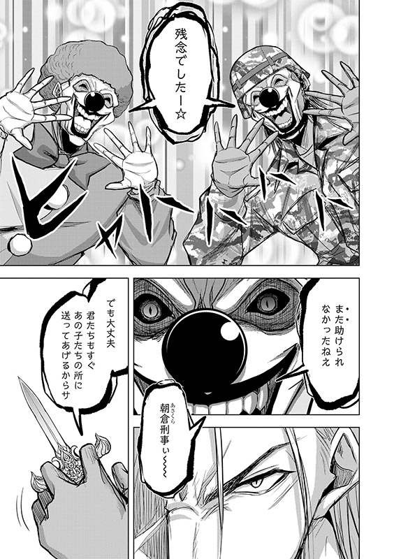 20XX年。 国民がICチップで管理され、犯罪者の特定・逮捕が容易になったにもかかわらず、 全国各地で正体不明の○人鬼による○○を狙った凄惨な○人事件が起きていた。 黒いマント・ピエロの仮面に身を包み、 殺害対象に「質問」を投げかける狂ったシリアルキラー――「○人ピエロ」と、警官・朝倉勇人の戦いが始まる!