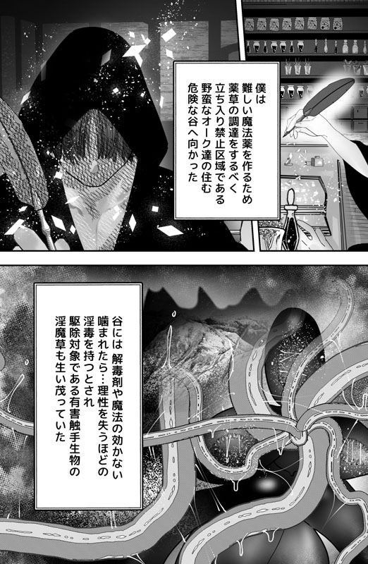 優秀な魔法使いルカ。彼は、薬草の調達をしているさいに淫毒を持つ触手生物に噛まれてしまう。毒により、理性を失ったルカは触手による強○快楽の底に堕ちてしまい…
