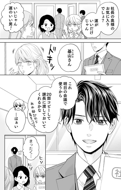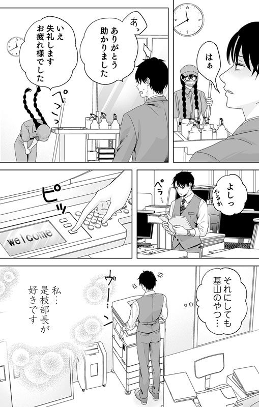 そんな彪が一人深夜のオフィスで残業をしていると、眼鏡に三つ編みの超地味な清掃員に声を掛けられる。不出来な部下がゴミ箱に捨てた重要書類を拾ってくれたのだ。それが縁でその清掃員・柳田椿と徐々に親しくなっていく彪。