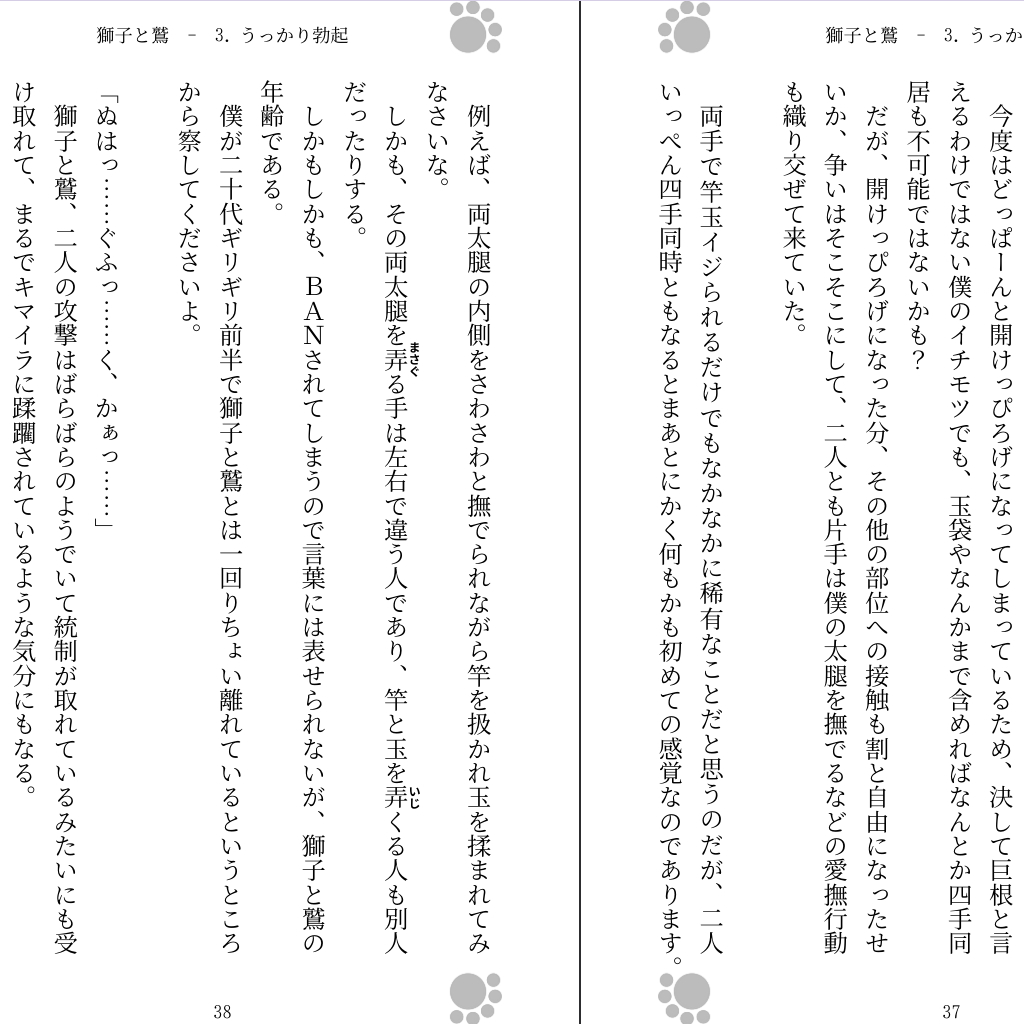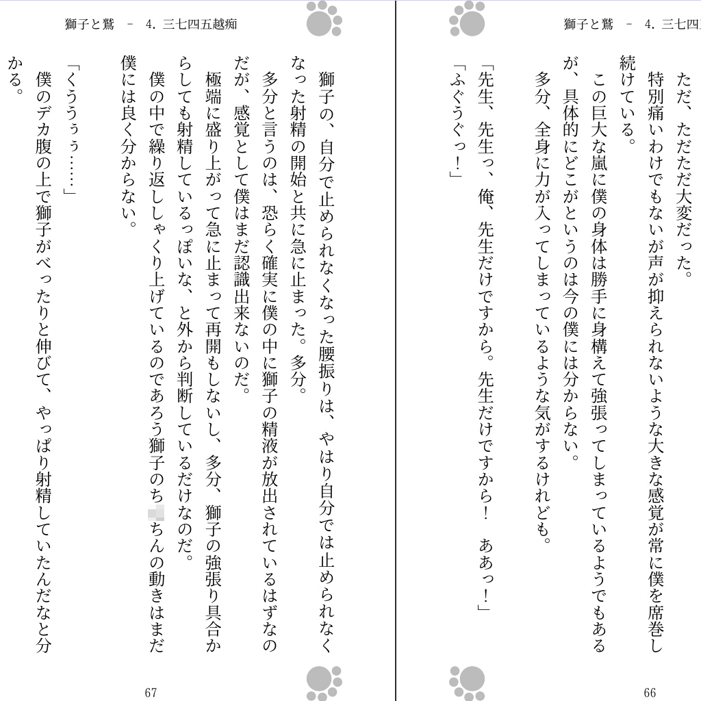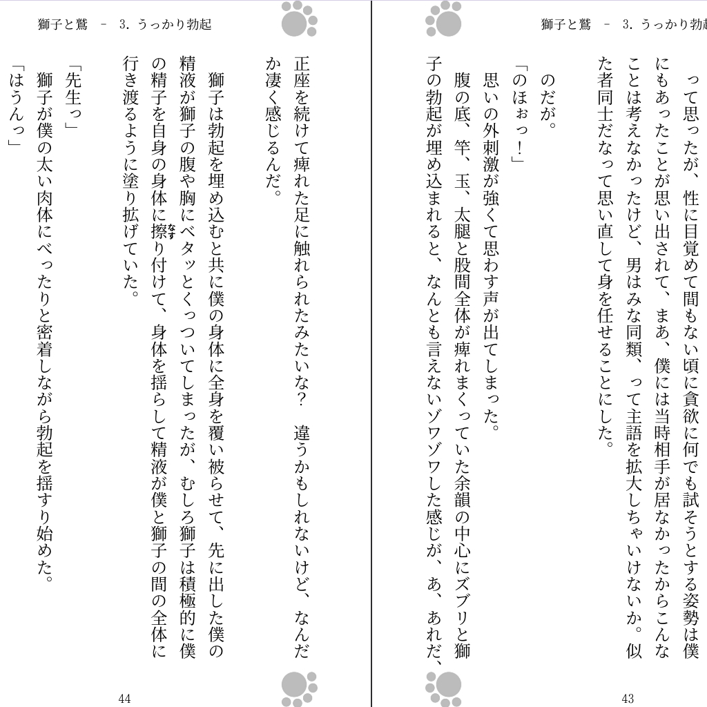 若者の前で第二次性徴を迎えた獅子と鷲は、その若者がきっかけで性に目覚めたと言い、しかし、単純に性交渉を強請るわけにもいかないことを勉強した二人は若者に対して「動かないで」「なすがままにされてくれ」と懇願する。