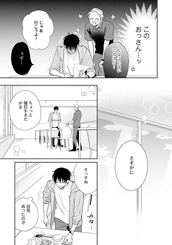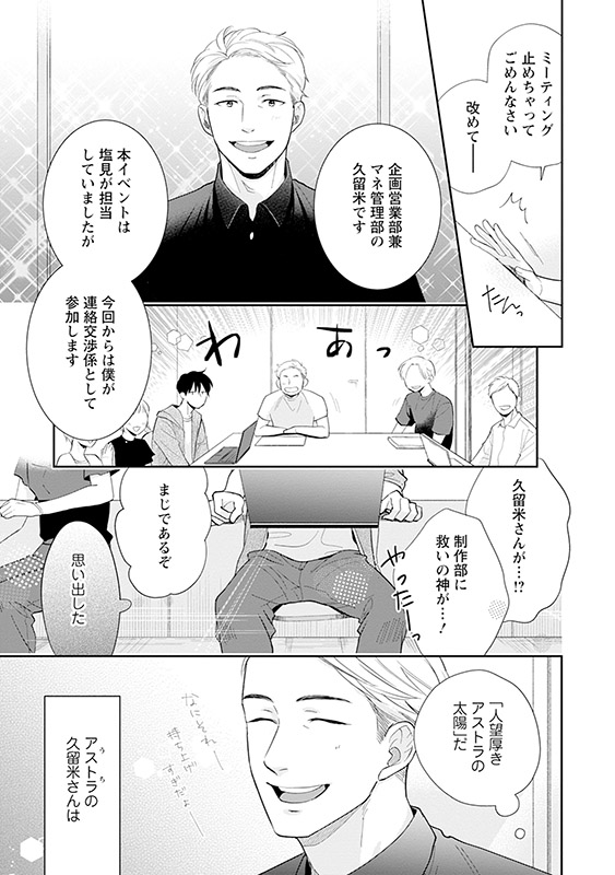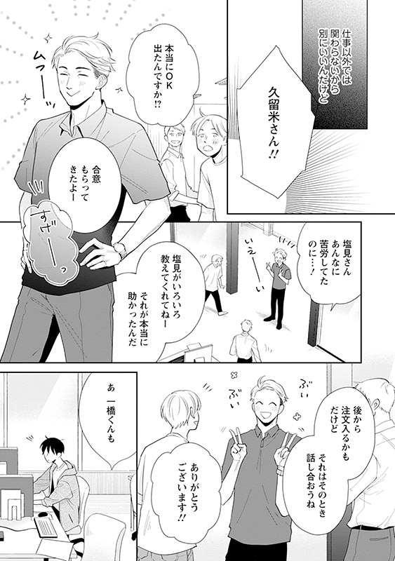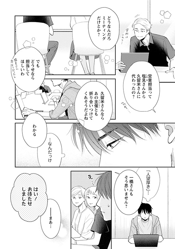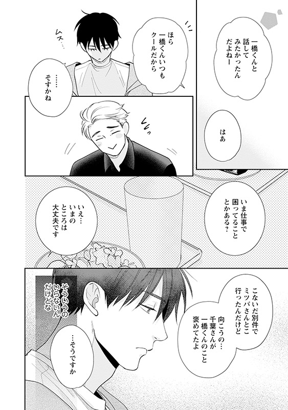 芸能事務所で働く一匹狼な会社員・一橋は、社交的で陽キャな先輩・久留米が苦手だった。しかし、同じプロジェクトで仕事をする中で、ふいに久留米が食べる姿に欲情してしまう。