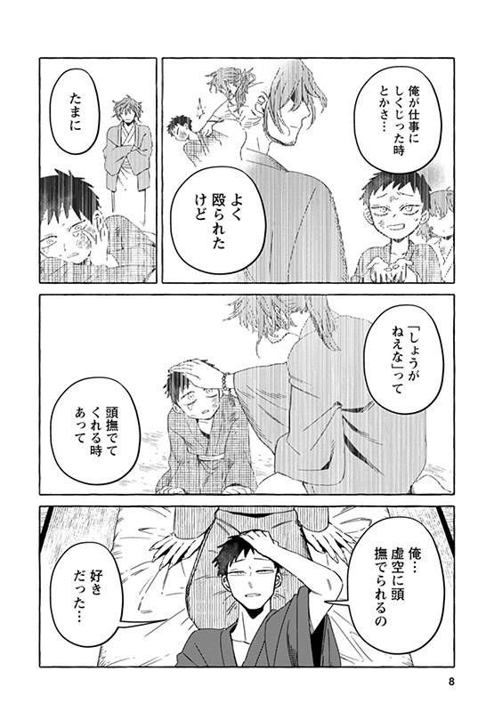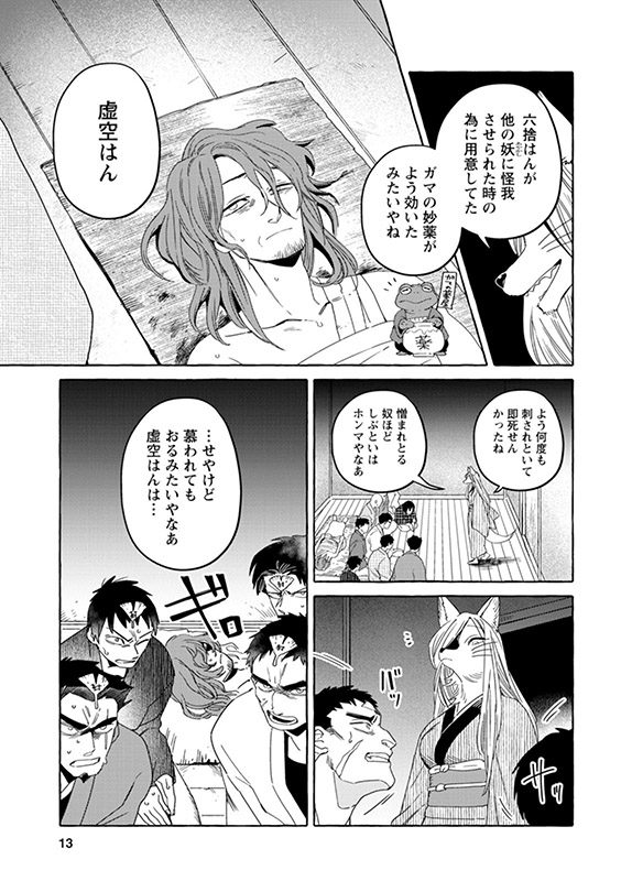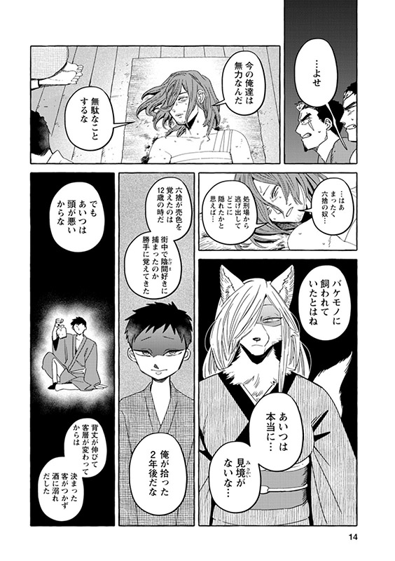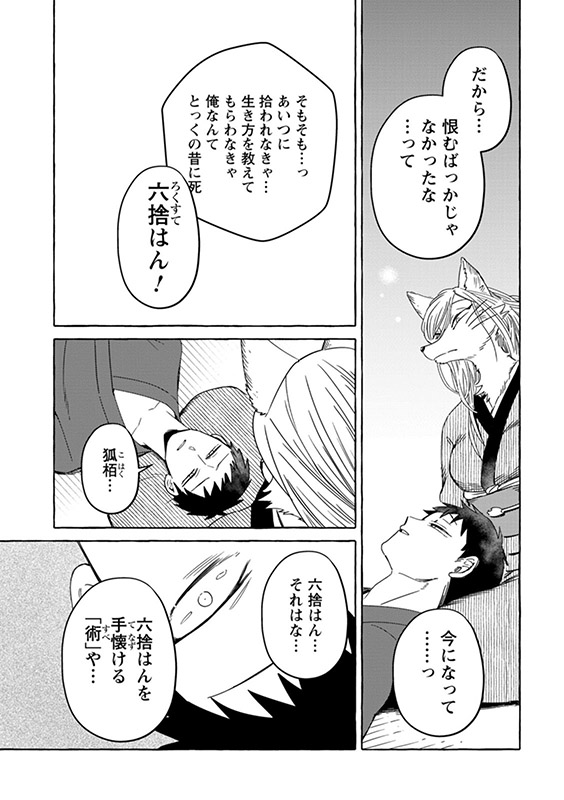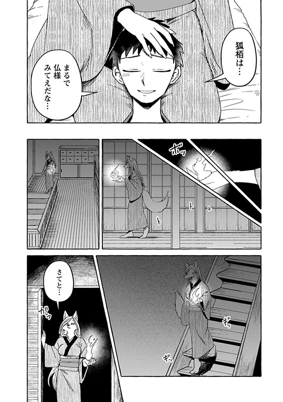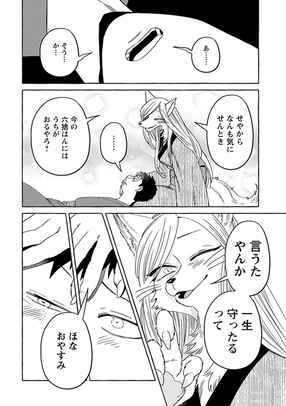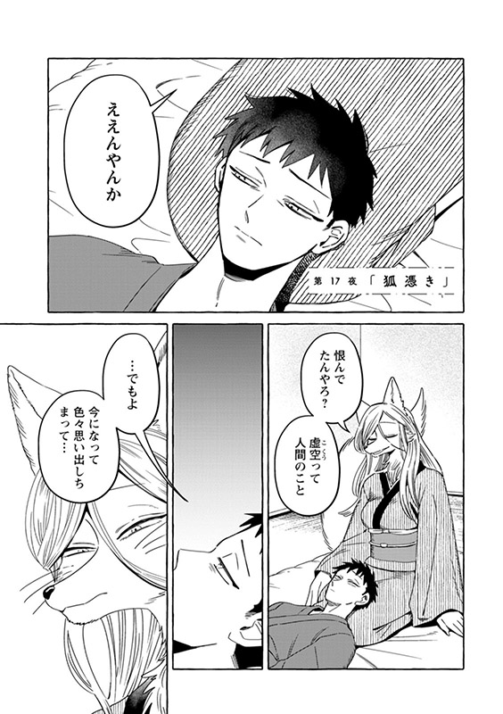 時は明治――現世と隠世がまじりあう世界に暮らす女妖狐「狐栢」と罪人の男「六捨」は新婚夫婦。”愛してるフリ”を続けていた二人だったが、しだいに”家族”を意識するように。男やもめの古狸・又次の元に身を寄せる未亡人・片江は、子狸たちにすっかり懐かれ…。しかし、穏やかな日常のなかに血生臭い虚空の影がチラついて――?