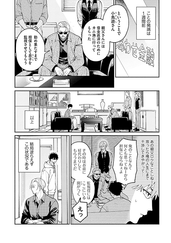 借金を負った父親のせいで、担保として取り立て屋の開と同居(※監視)させられることになった大学生の小鳥遊。