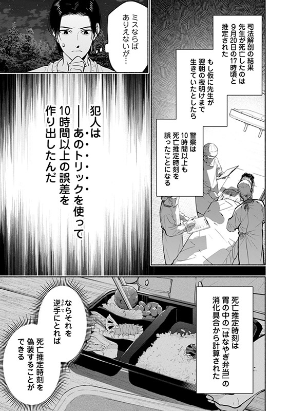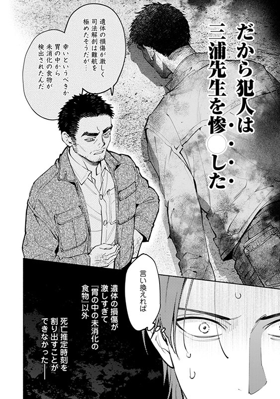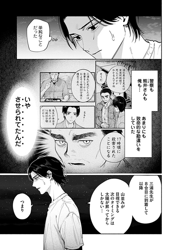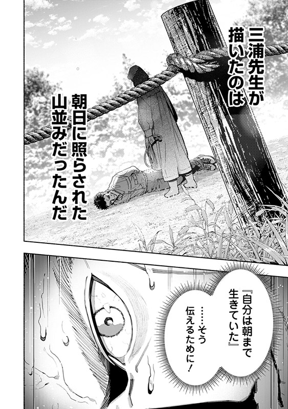 殺害された恩師・三浦の当日の行動をなぞり、K山に登る岩田。8合目にたどり着くと、「山並みの絵」と実際の風景を見比べ、ある“違和感”に気づく。それは、犯人が仕掛けたトリック、そして三浦がスケッチに込めた真意を解き明かす鍵だった──。