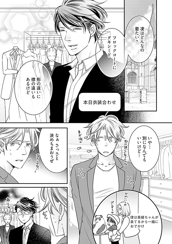 料理上手で○○好き。結婚願望もあるのに【とある理由】で、いまだ独身な三十路の建築士・宮野凌(みやの りょう)。ある日、火事で自宅マンションが水浸しになってしまった親友・大我(たいが)の頼みで、大我が引き取った甥・律(りつ)と3人で同居生活することに。かわいい律の世話を焼くのは楽しいけど――学生時代から凌を想い続ける大我の過剰なスキンシップに振り回される毎日で!?!?