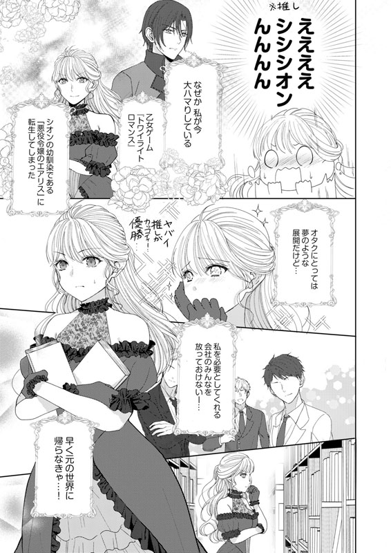 社畜OLのレイコ。残業帰りにマンホールに落ちて乙女ゲーム世界の悪役令嬢エアリスに転生。その幼馴染である推しのシオンとの夢のような時間を過ごす中…元の世界に戻ろうと模索する日々。ようやく帰る方法を見つけるが、なぜかシオンに告白されてしまう。