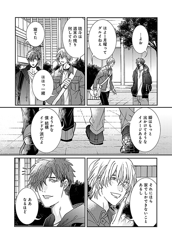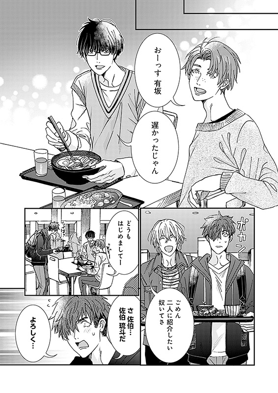 高校時代、とんでもないワルだった琉斗は、心を入れ替え猛勉強の末に大学へ入ったが、一匹狼だった彼は友達の作り方さえ知らなかったのだった…。ところが、そんな彼の前に有坂瞬(ありさかしゅん)という爽やかイケメンが現れる! 同級生との会話という未知との遭遇に、ドギマギしっぱなしの琉斗は──…?