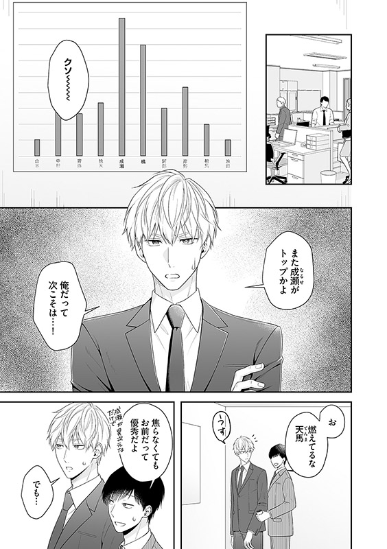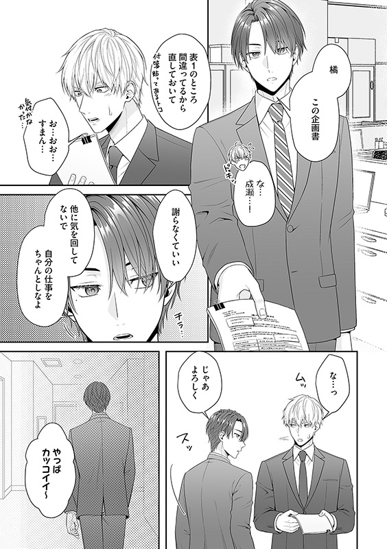 高梨藍『成瀬のくせに、Ωのくせに、エロすぎんだろ』αの橘は、営業成績トップの成瀬を勝手にライバル視。鼻持ちならないと感じつつも、残業を手伝ってもらって、なにやらほだされ気味。そんななか、成瀬は突然体調をくずし!!?