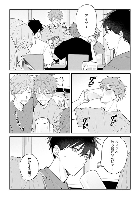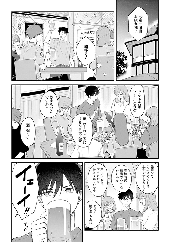 テニスサークルの合宿で、サツキは酔って無防備になった恋人・アヤトを部屋で介抱する。酔った原因が嫉妬によるものだと知ったサツキは、我慢できずアヤトを押し倒して――?