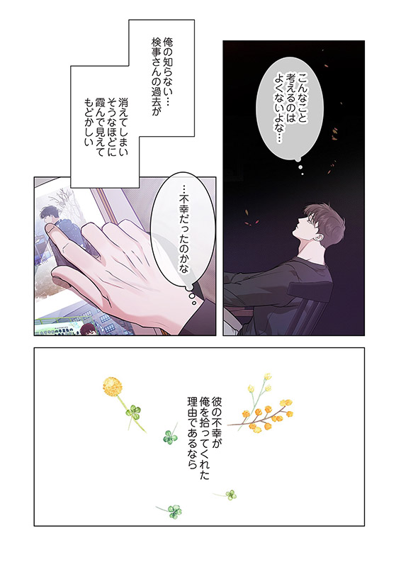 生き残るためにどれだけ努力を重ねても報われない。この世界のどこにも居場所なんてない。 すべてに虚しくなっていた碧(あおい)の前に突然 現れたのは検事の縁家(えんや)で、彼は見知らぬ碧に衣食住を提供してくれるという。 「俺に何をして欲しいの?」「何も」 見返りを求めない優しさはないと学んできた碧は縁家の言うことが理解できず彼を疑うが、共に過ごすうちに彼の言葉を信じたいと思うようになり…。 孤独を抱える二人のセンシティブ・ストーリー。【フィカス】