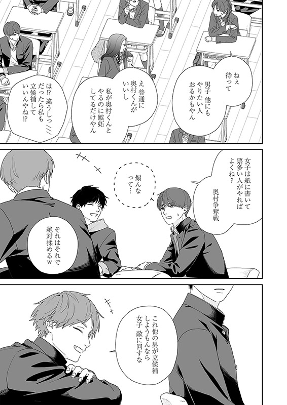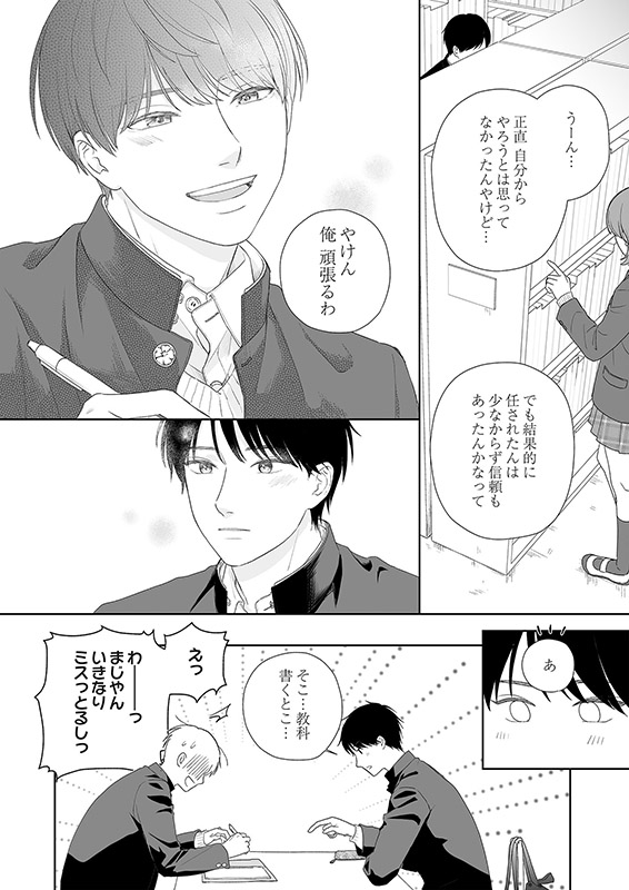 人気若手俳優・奥村は、高校の同窓会に参加するため地元に戻ってきていた。そこで再会した元恋人・古本に助けられ、胸がぎゅっと締め付けられる。何故なら今でも古本のことが好きだから…。不器用な自分をからかう声、繋いだ手のぬくもり、何年経っても古本を忘れることはできなかった。「なぁ…久しぶりにシようよ」つい口走ってしまった奥村に、古本は…?