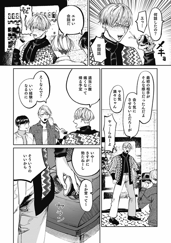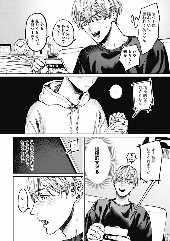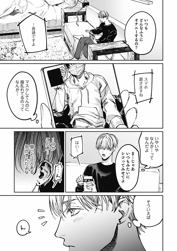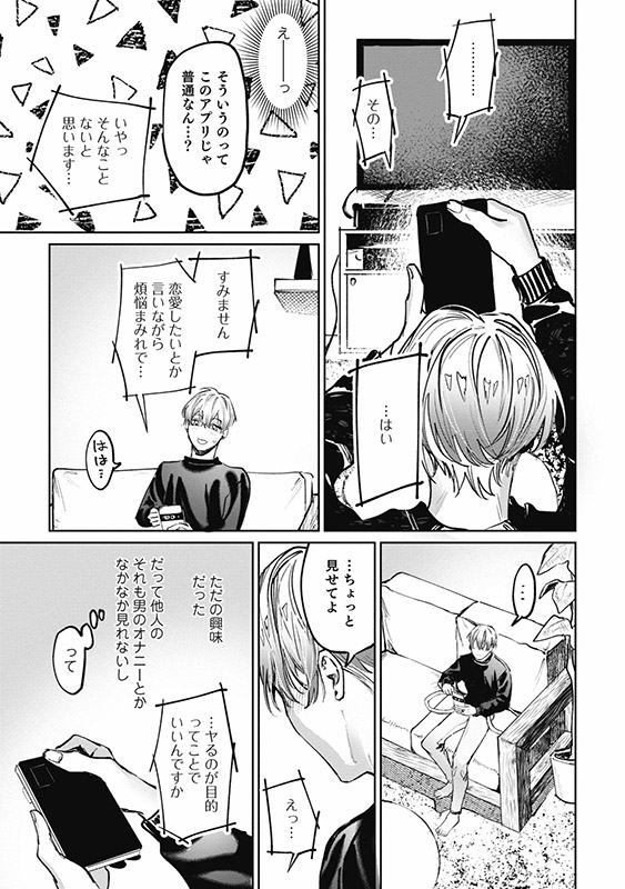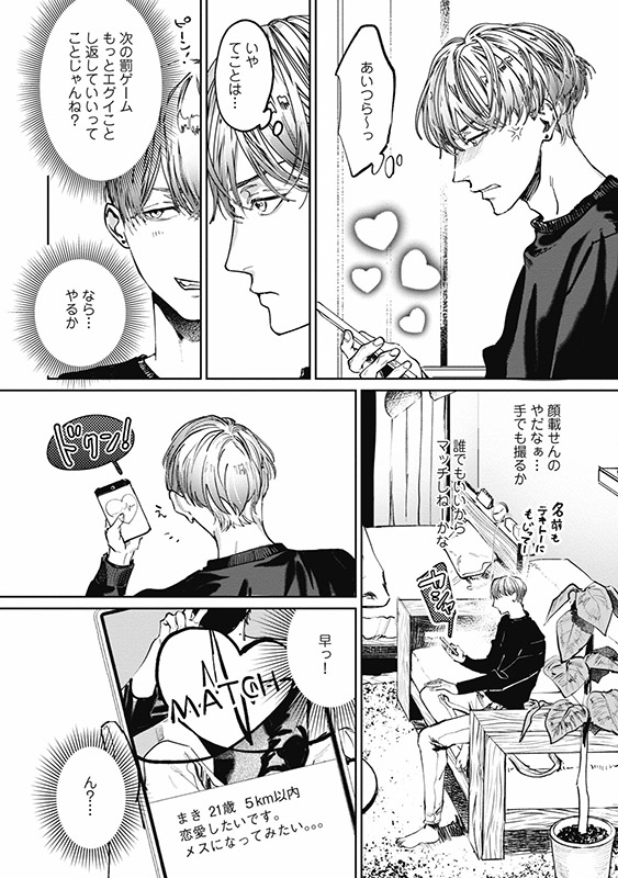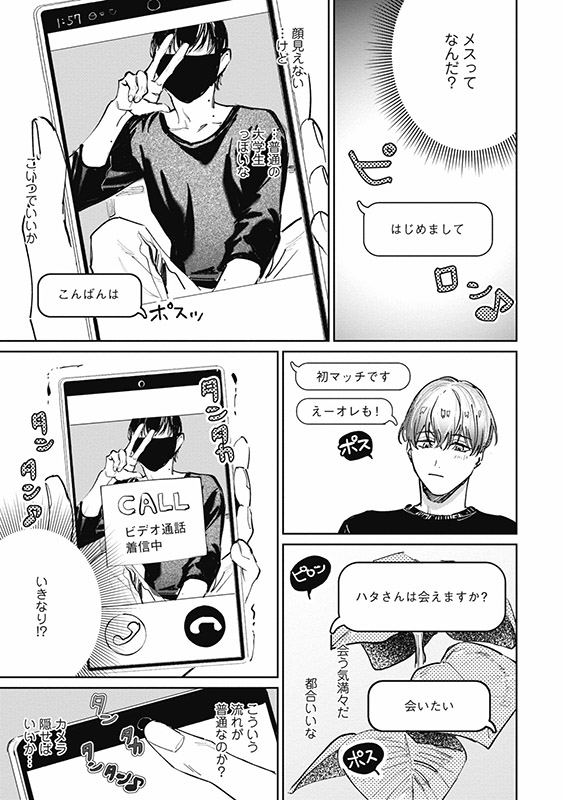 <マッチ相手と写真を撮る>というミッションをこなすため、首元のホクロがやけにエロい男・まきと連絡をとることに。