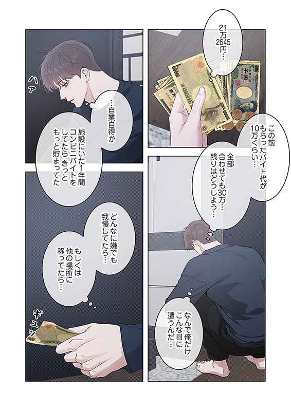 生き残るためにどれだけ努力を重ねても報われない。この世界のどこにも居場所なんてない。 すべてに虚しくなっていた碧(あおい)の前に突然 現れたのは検事の縁家(えんや)で、彼は見知らぬ碧に衣食住を提供してくれるという。 「俺に何をして欲しいの?」「何も」 見返りを求めない優しさはないと学んできた碧は縁家の言うことが理解できず彼を疑うが、共に過ごすうちに彼の言葉を信じたいと思うようになり…。 孤独を抱える二人のセンシティブ・ストーリー。【フィカス】