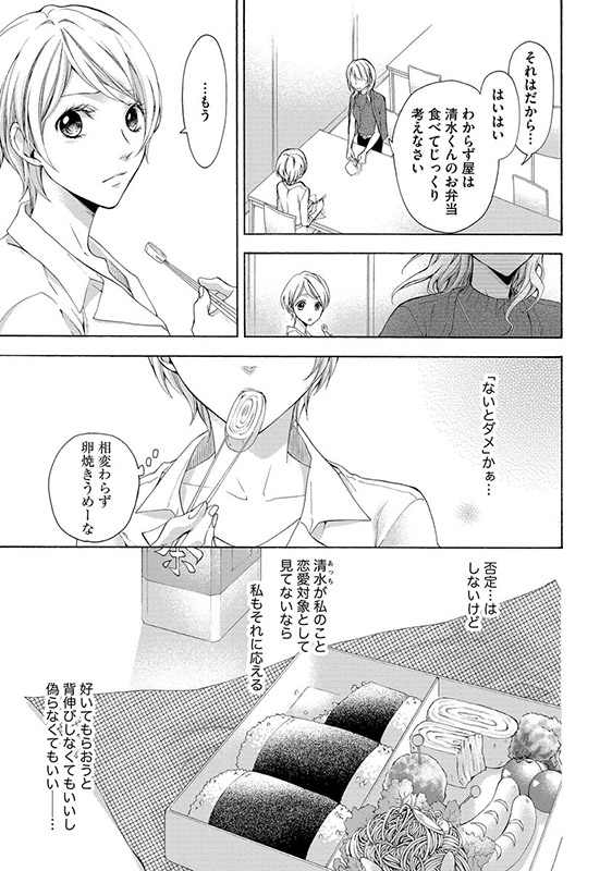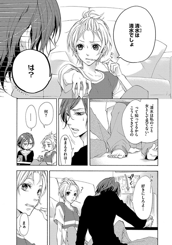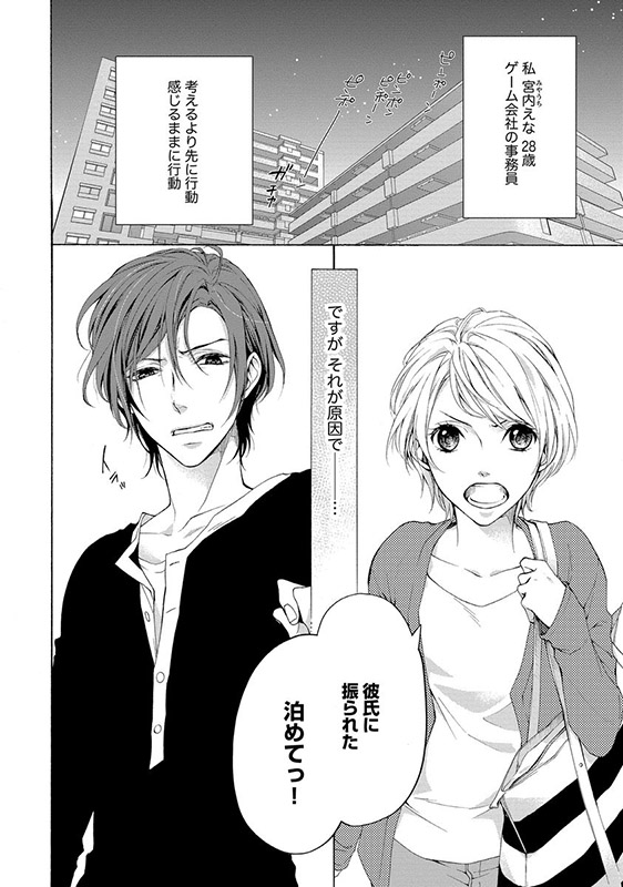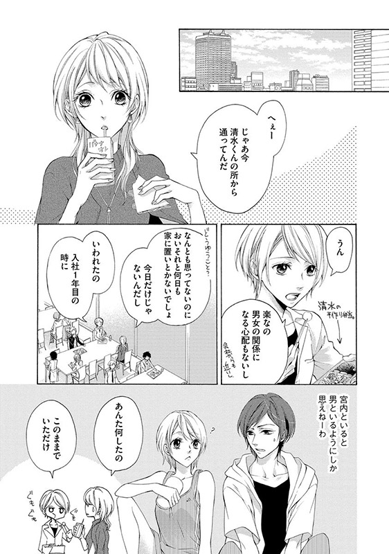 ある日、同棲中の彼氏にフラれたえなは、仲のいい同僚・清水の家に転がり込む。外見もボーイッシュでサバサバした性格のえなは、清水と入社当初から友達のように付き合っていた。ある夜、居候中の部屋で彼の意外な一面を見たえなは、清水が男の顔に見えてきて――?