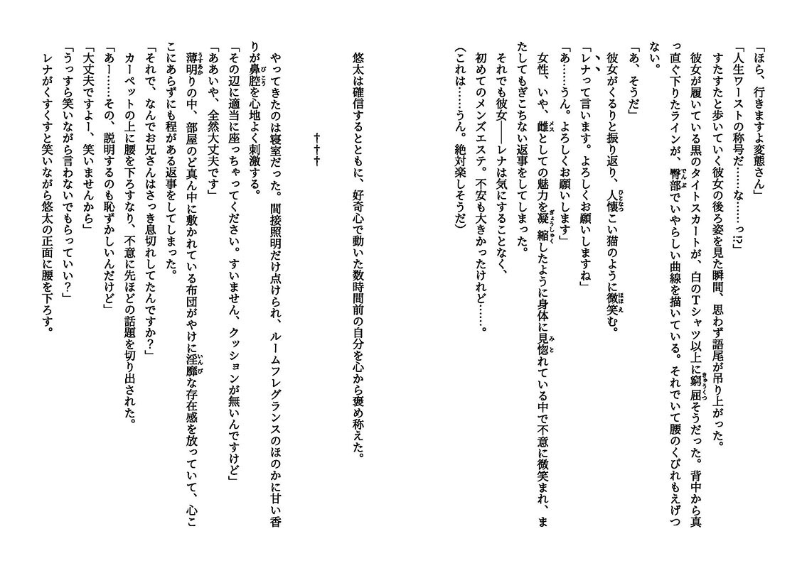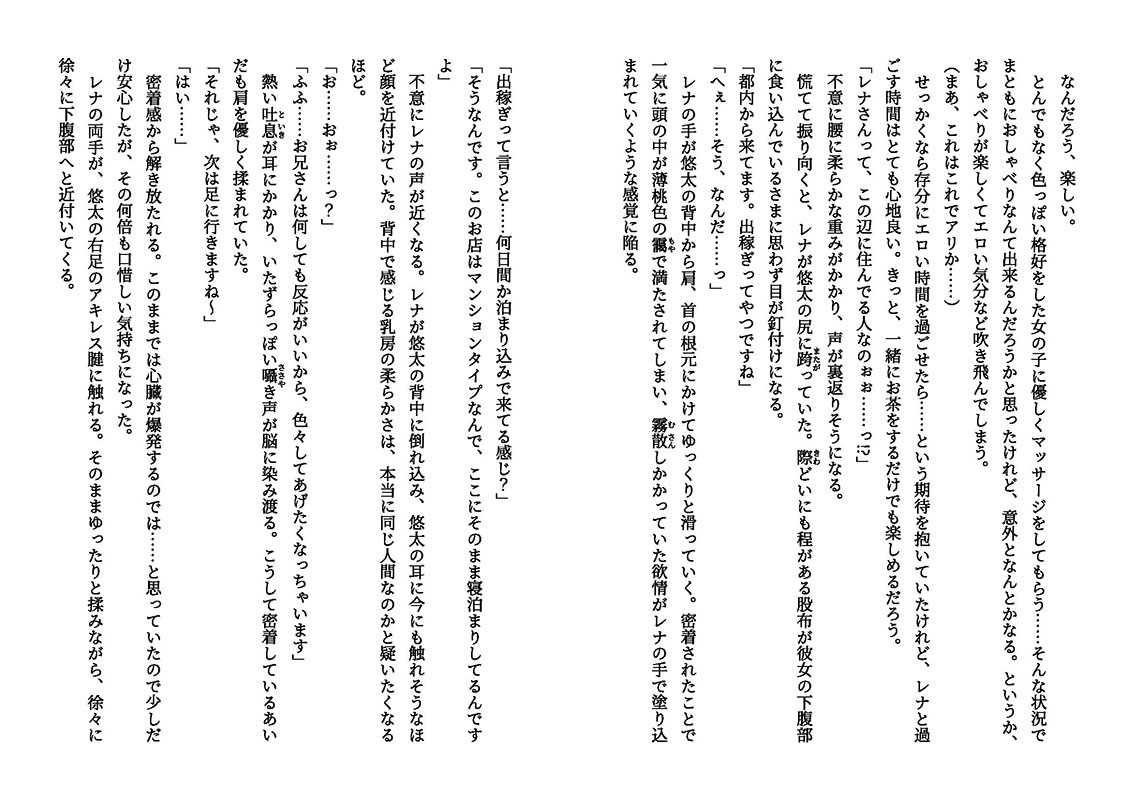 地方都市での在宅ワークで性欲を持て余す32歳の悠太が初体験のメンズエステで出会ったのは、東京から出稼ぎで来た24歳の玲奈だった。