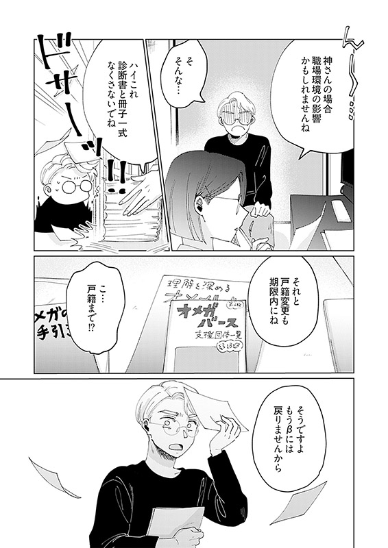 念願叶って名門・私立稜星高校(通称α校)の教壇に立てることになったβ教師・神 伊織(じん いおり)。α教師たちとの能力差を埋めるため、必死に頑張っているけれど、毎日残業で疲労困憊、プライベートもままならず…。「今、神先生の身体でΩの発情が起きているようです」ある日の残業中、教育係のα教師・逢坂(おおさか)と口論になりかけたタイミングで神の身体に異変が…!? βのはずなのになぜか発情してしまい、熱に浮かされたまま逢坂と関係を持ってしまって!?